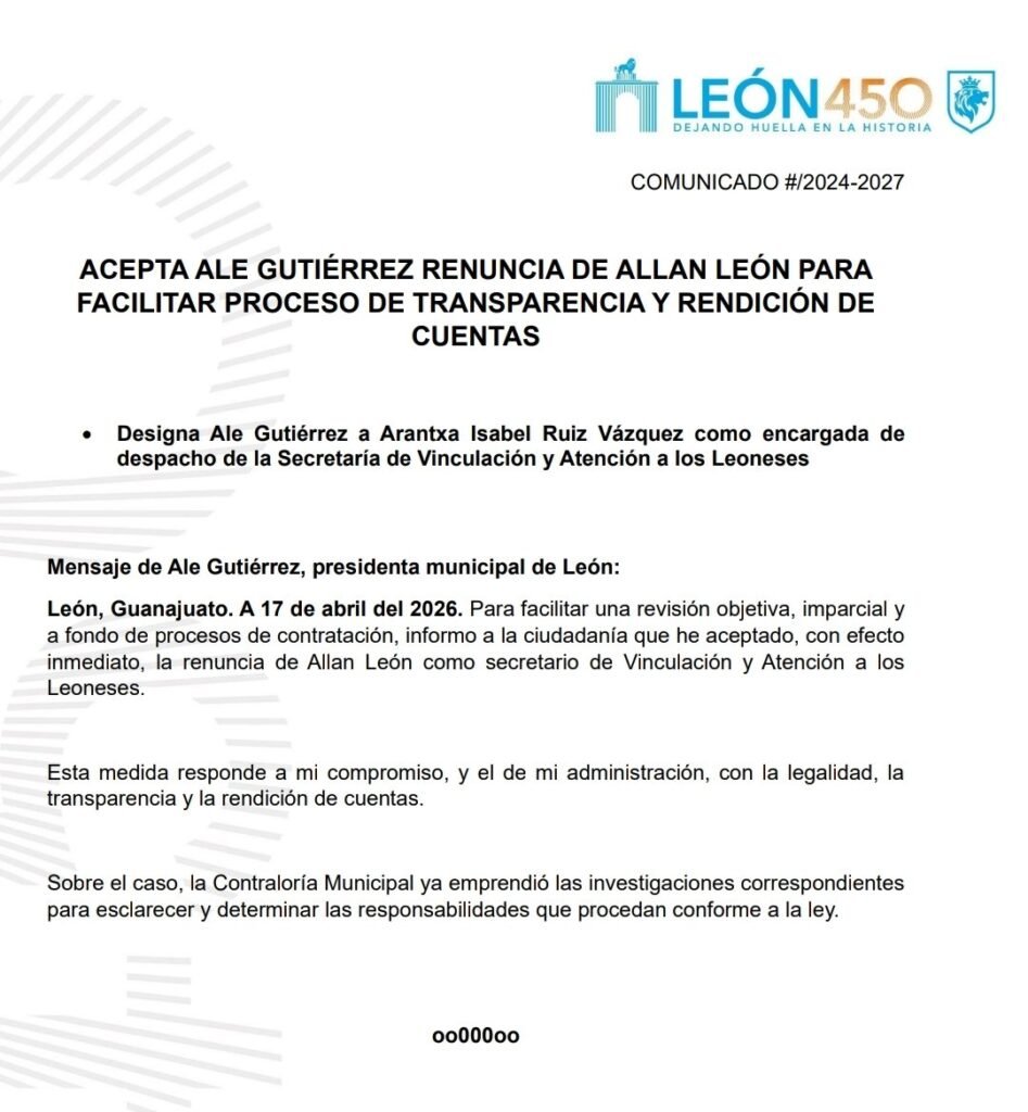 Cerca de la media noche del viernes 17 de abril, el municipio de León compartió un comunicado para informar la aceptación de la alcaldesa de la renuncia del hoy ex funcionario Allan León.