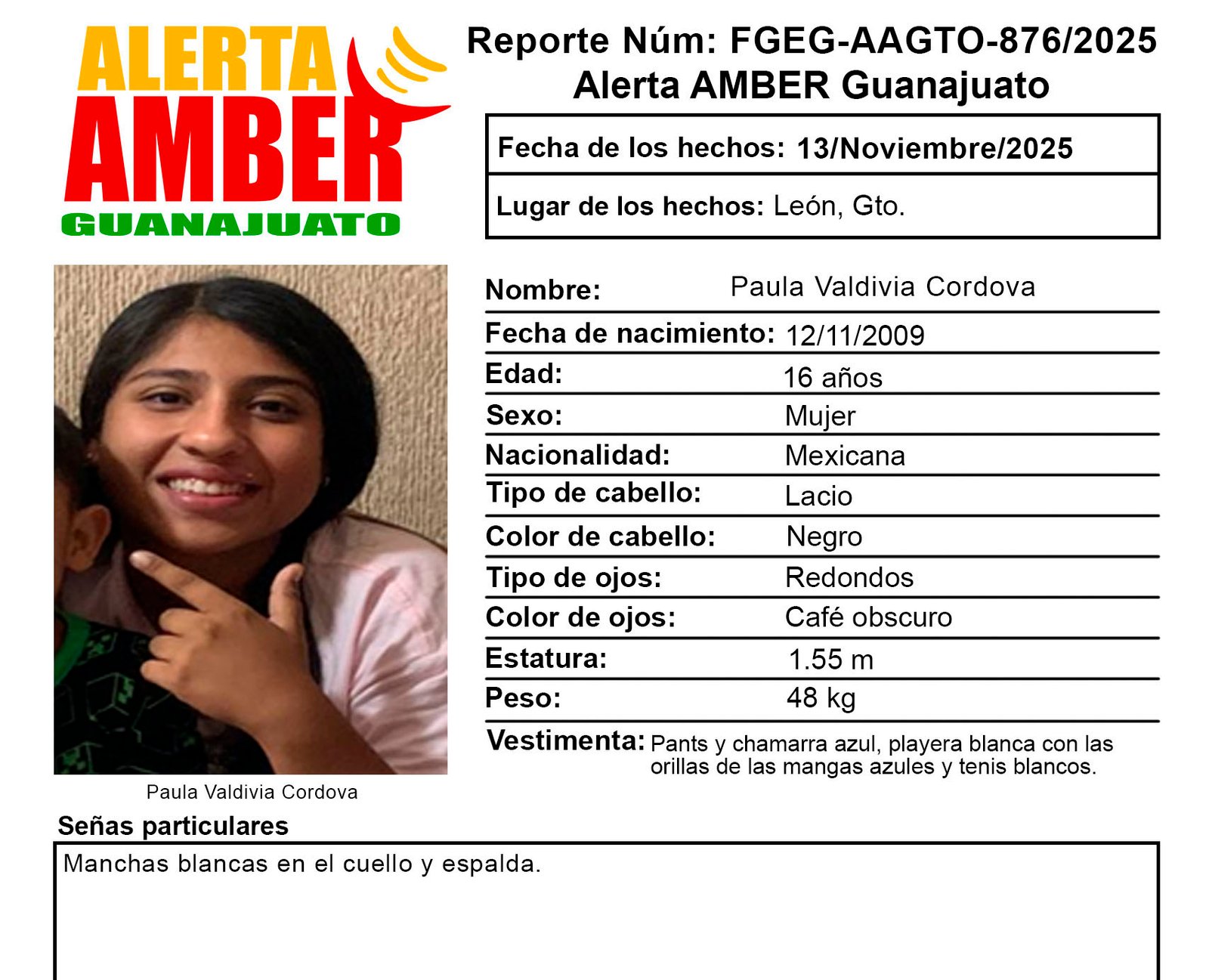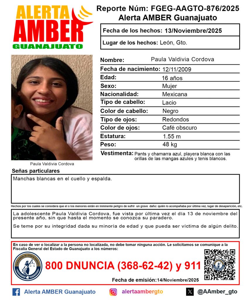 Se activó la ficha de búsqueda por Alerta Amber Guanajuato por la adolescente Paula Valdivia Cordova, quien fue vista por última vez el 13 de noviembre del 2025 sin que hasta el momento se conozca su paradero.