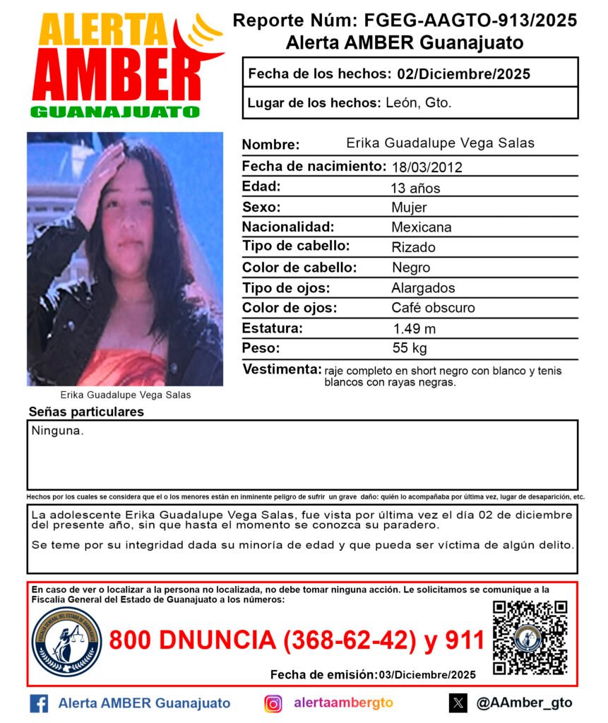 Alerta Amber Guanajuato activó una ficha de búsqueda para localizar a la adolescente Erika Guadalupe Vega Salas de 13 años de edad.