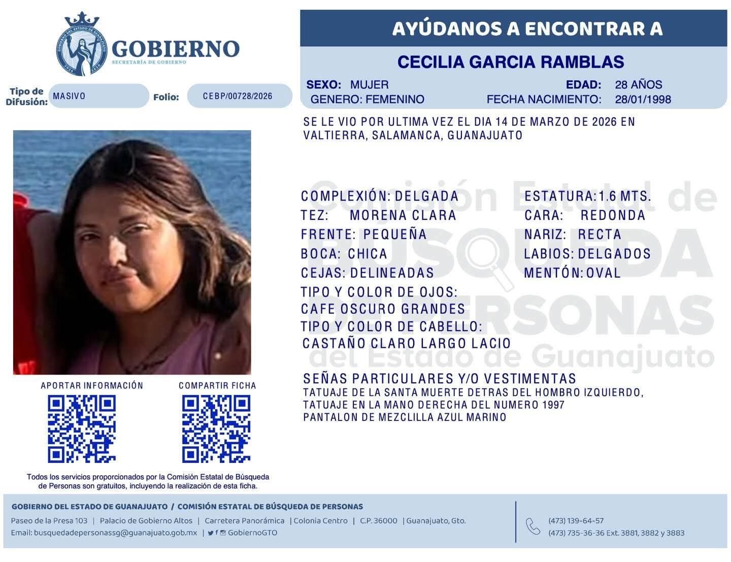 La Fiscalía General del Estado informó que el pasado 18 de marzo de 2026 fue localizado el cuerpo sin vida de Cecilia “N”, integrante de un colectivo de búsqueda en Salamanca, tras labores de investigación encabezadas por el Ministerio Público.