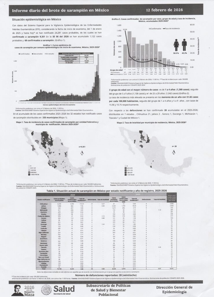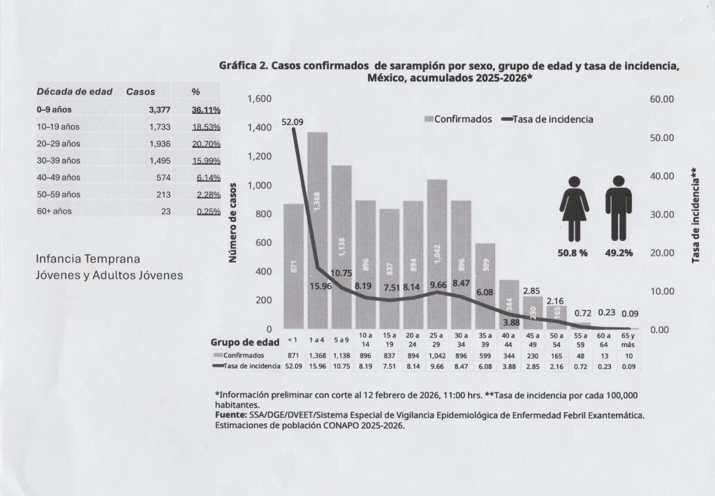 De acuerdo a datos oficiales con corte al 12 de febrero, en México se han registrado 3,377 casos en menores de 0-9 años, 1,733 casos en edades de 10-19 años, 1,936 casos en edades de 20-19 años, 1,495 casos en edades de 30-39 años, 574 casos en edades de 40-49 años, 213 casos en edades de 50-69 años y 23 casos en mayores de 60 años y más.