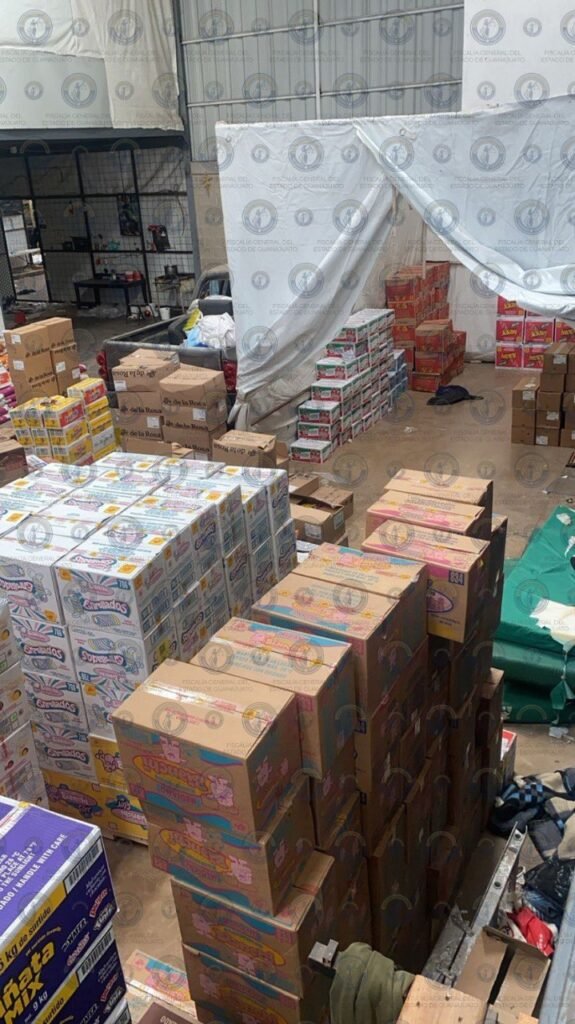 En el lugar se aseguró mercancía que se presume robada, entre lo que destaca insumos industriales y productos comerciales, así como más de mil costales de materia prima de panificación, cajas y contenedores rellenos frutales, productos de confitería, dulces y alimentos procesados para mascotas.