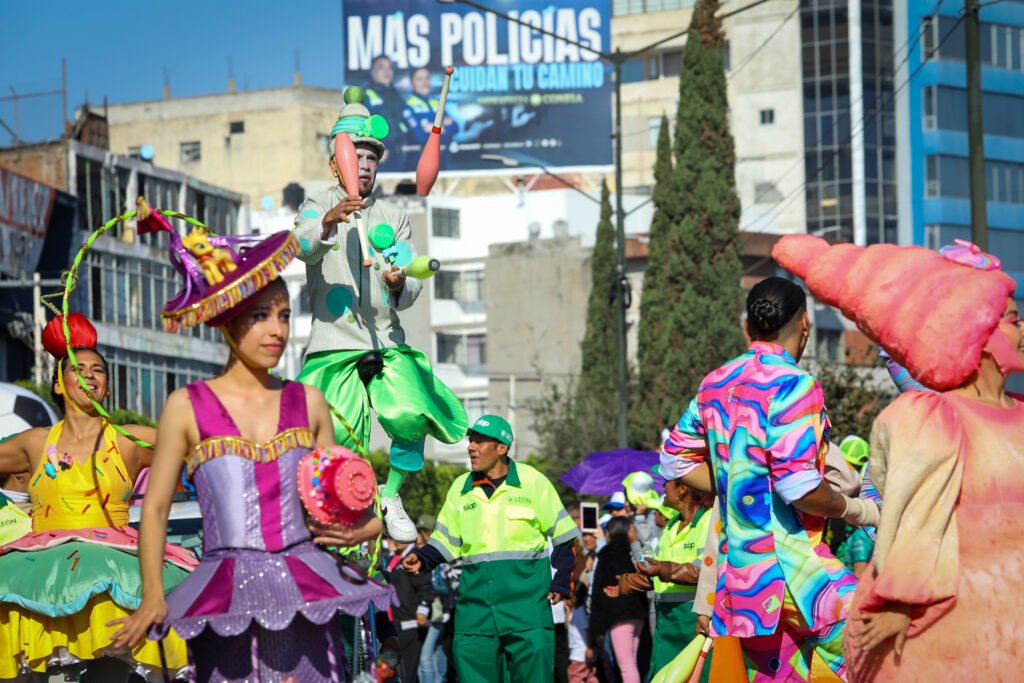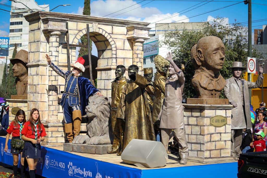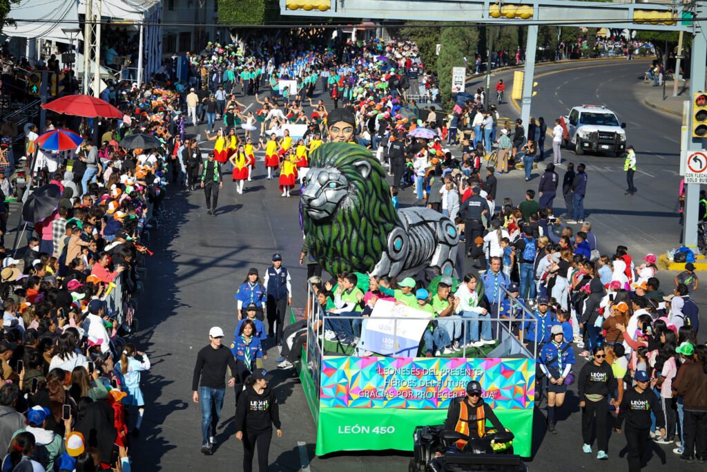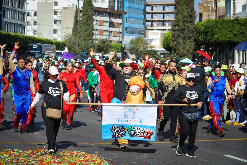 El desfile contó con la participación de más de 1 mil 500 personas distribuidas en 11 bloques temáticos que recorrieron la ciudad mostrando la evolución de León, desde sus raíces hasta su visión de futuro.