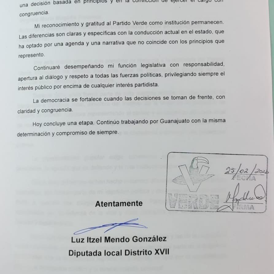 La diputada Itzel Mendo renunció a la militancia del Partido Verde en Guanajuato.