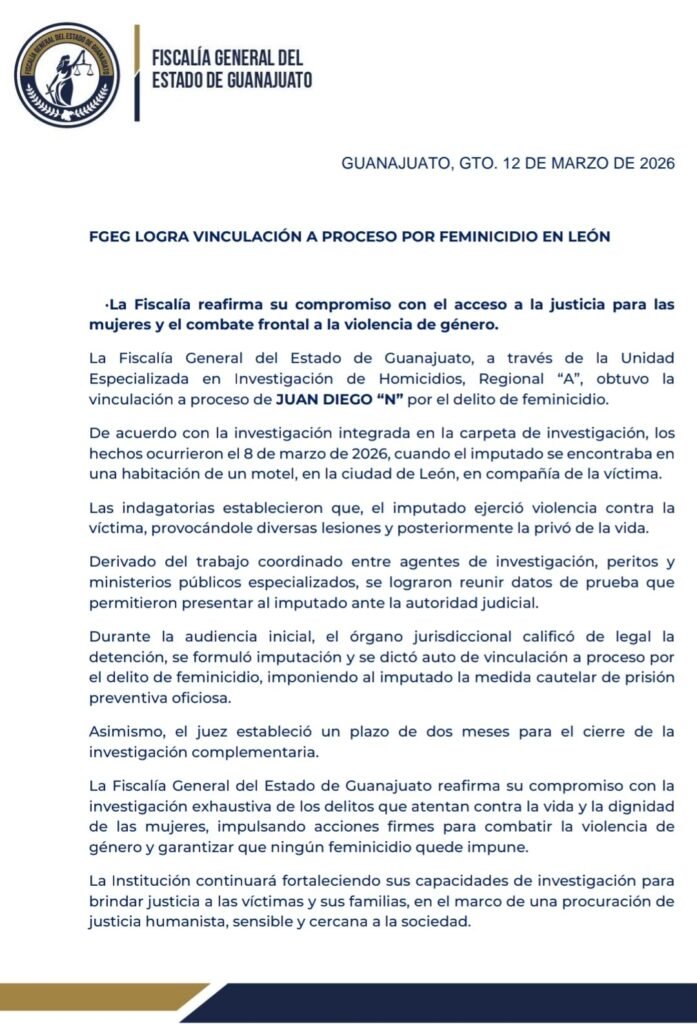 Vinculan a proceso a hombre como probable responsable de privar de la vida a mujer en un motel de la ciudad de León en pleno Día Internacional de la Mujer, el 8 de marzo del año del 2026, se le imputa Feminicidio.